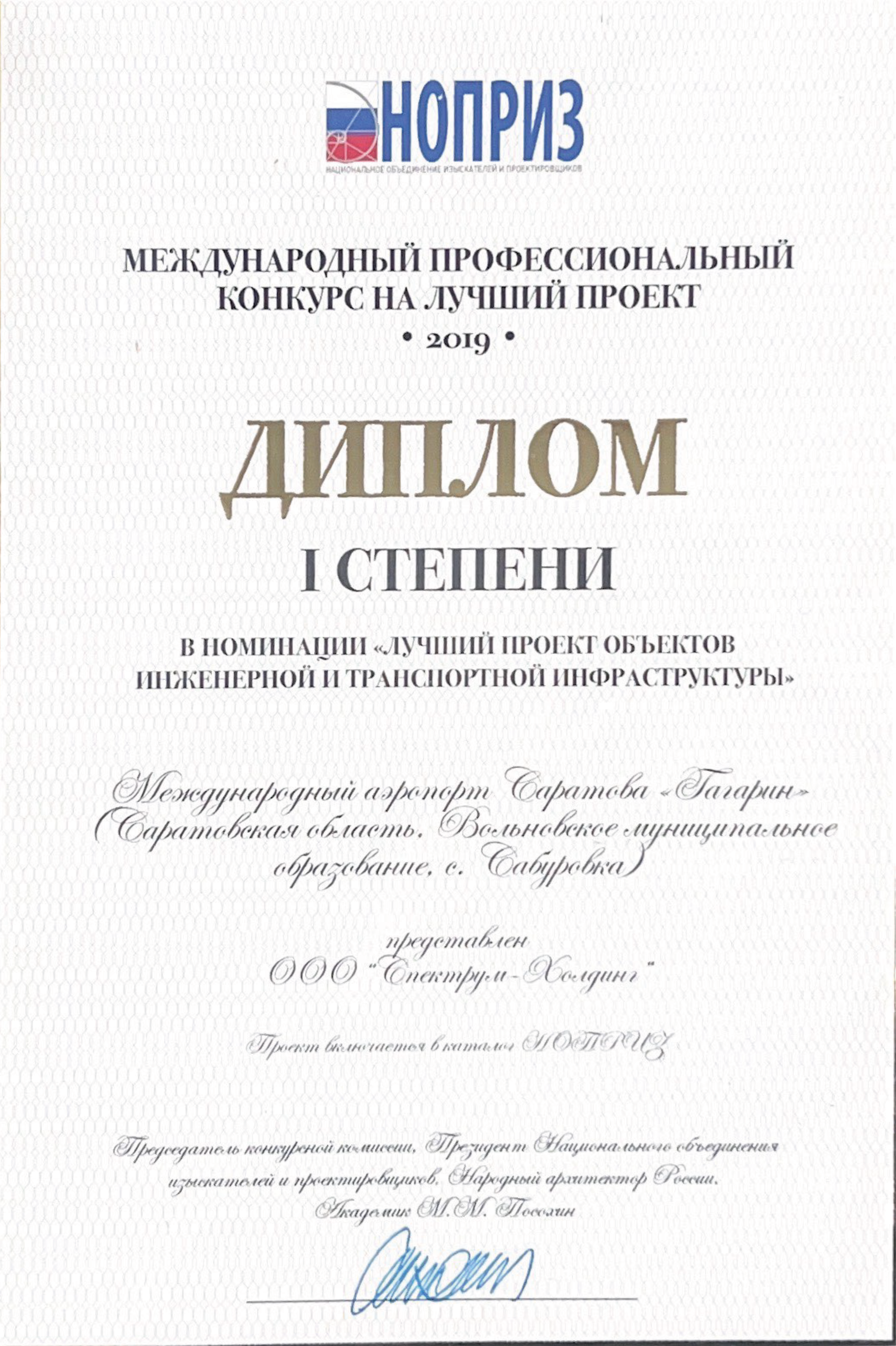 Дипломом I степени в номинации «Лучший проект объектов инженерной и транспортной инфраструктуры» награждена ГК «Спектрум» за международный аэропорт Саратова «Гагарин»