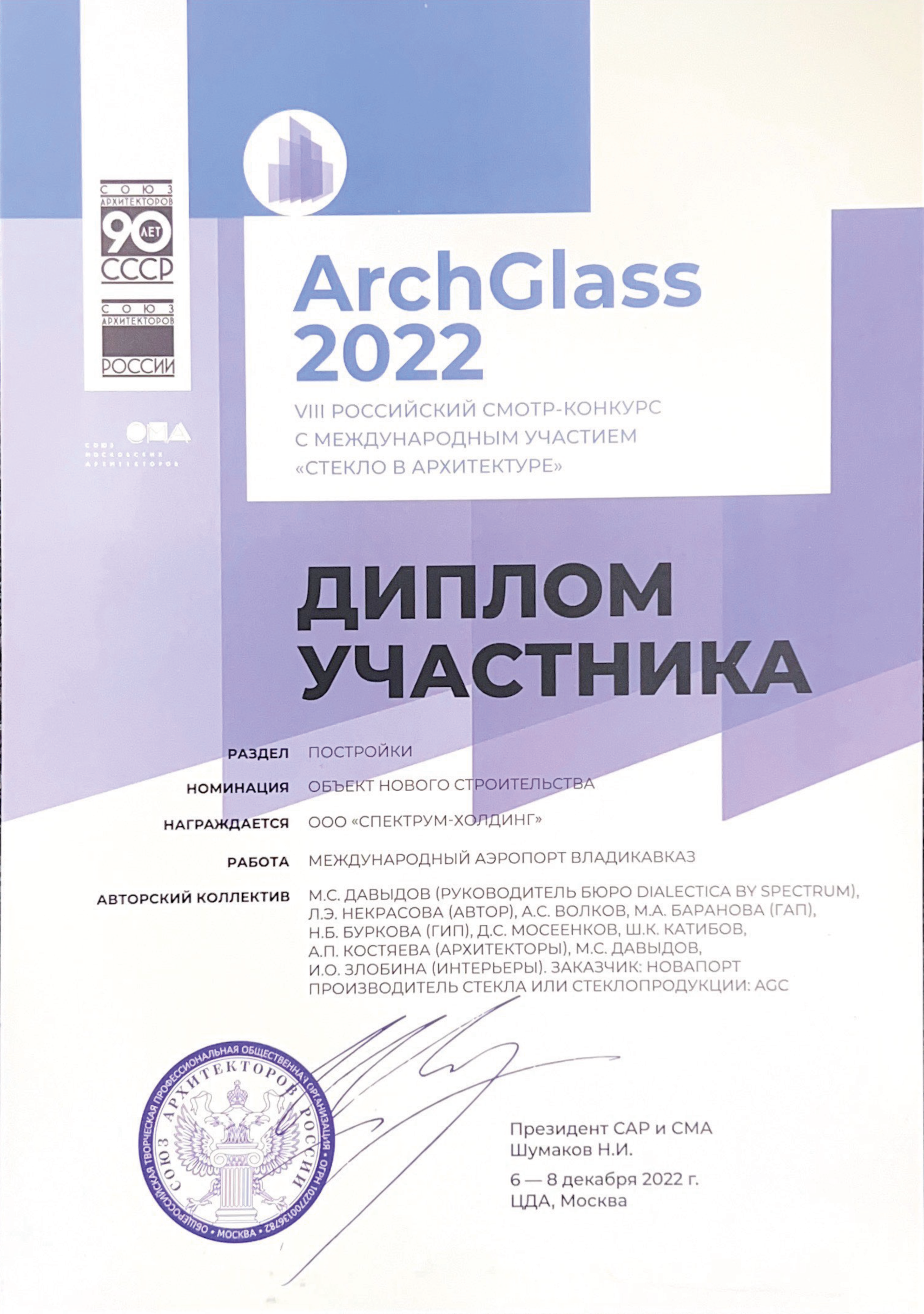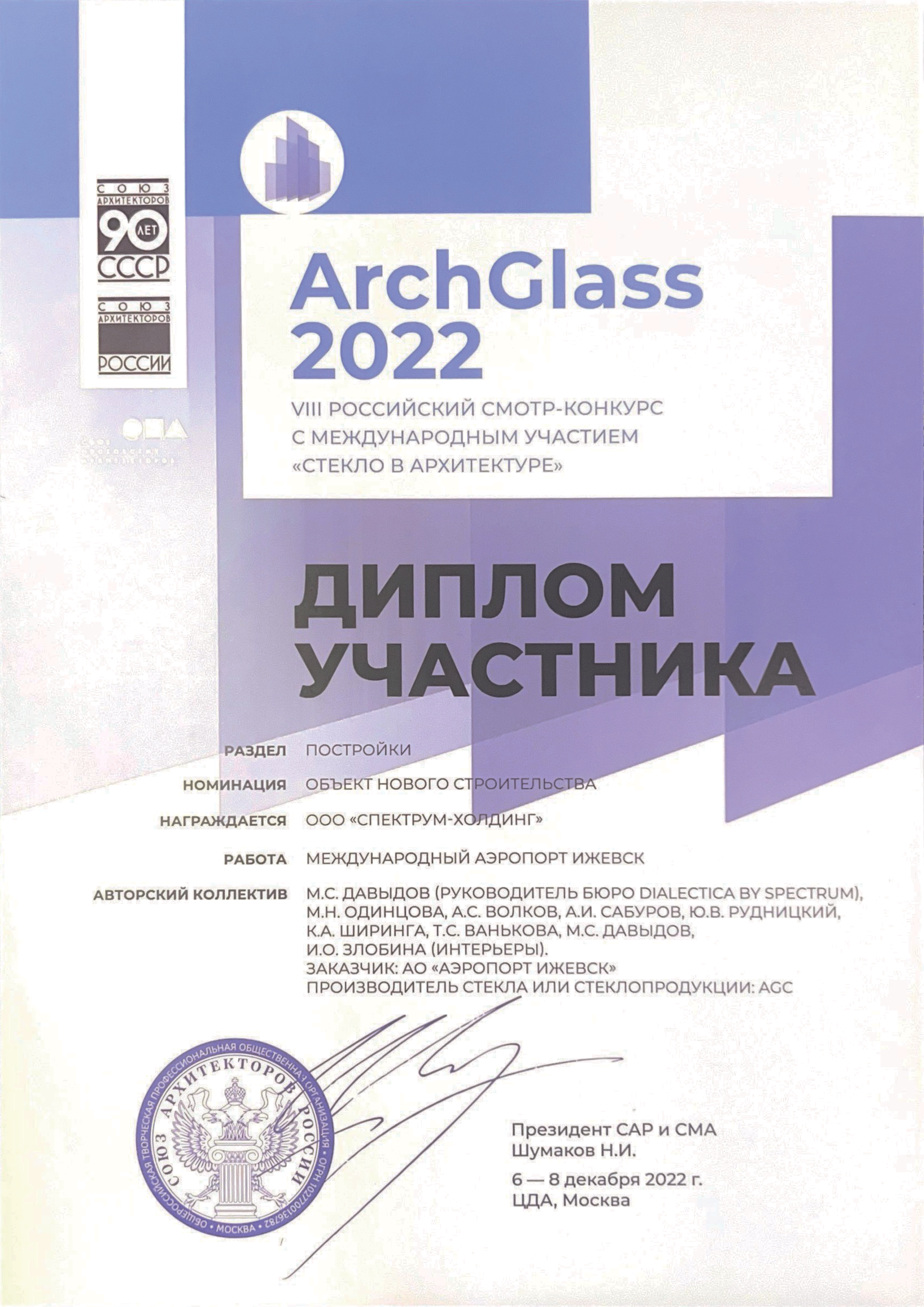 «Спектрум» стал Лауреатом смотра-конкурса «Архитектурные произведения. Проекты и постройки» в номинации «Промышленная архитектура и инфраструктурные объекты» и получил Диплом Союза архитекторов России за проект Международного аэропорта Ижевск.