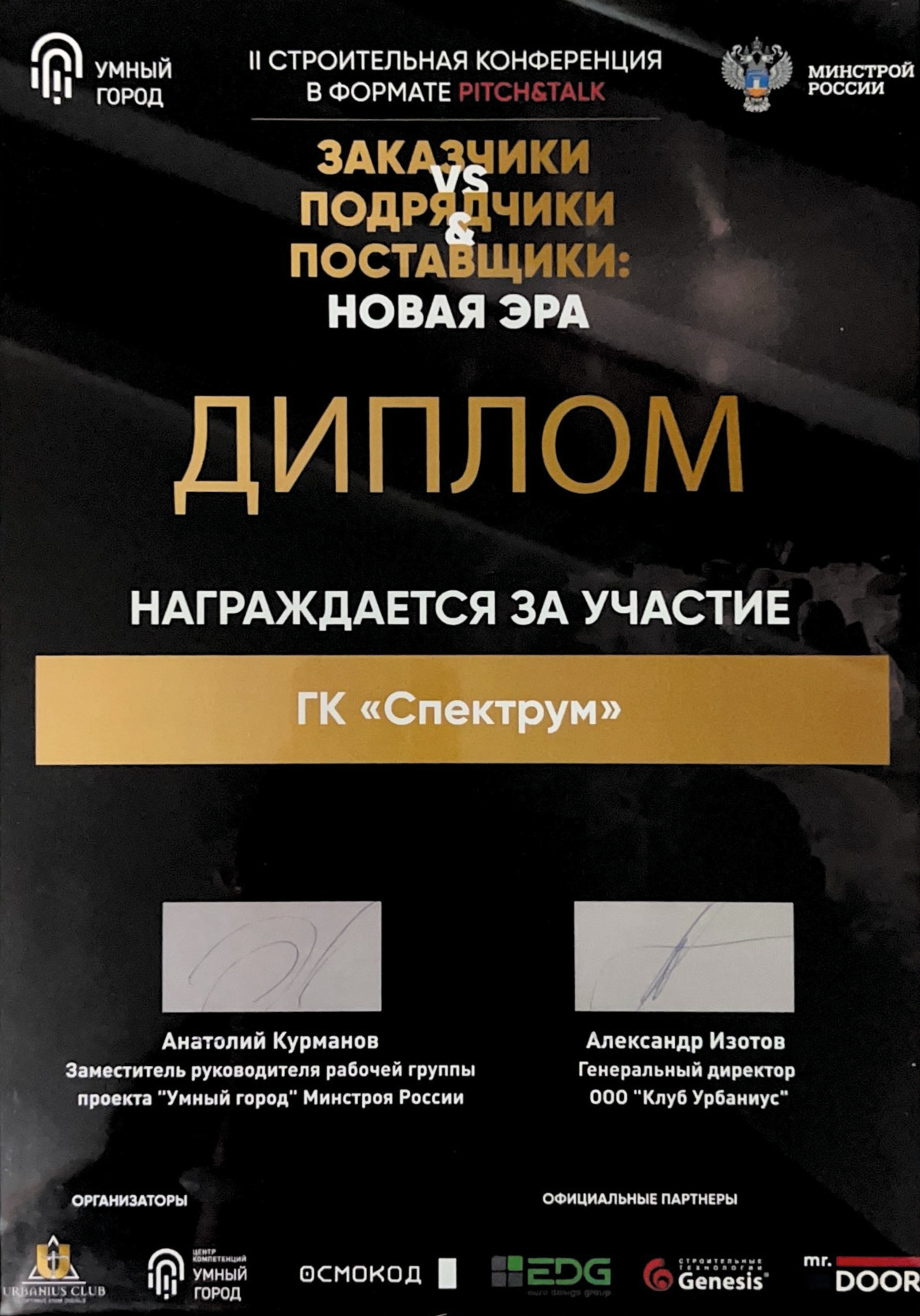 «Спектрум» награжден Дипломом за участие во II Строительной Конференции в формате Pitch&Talk