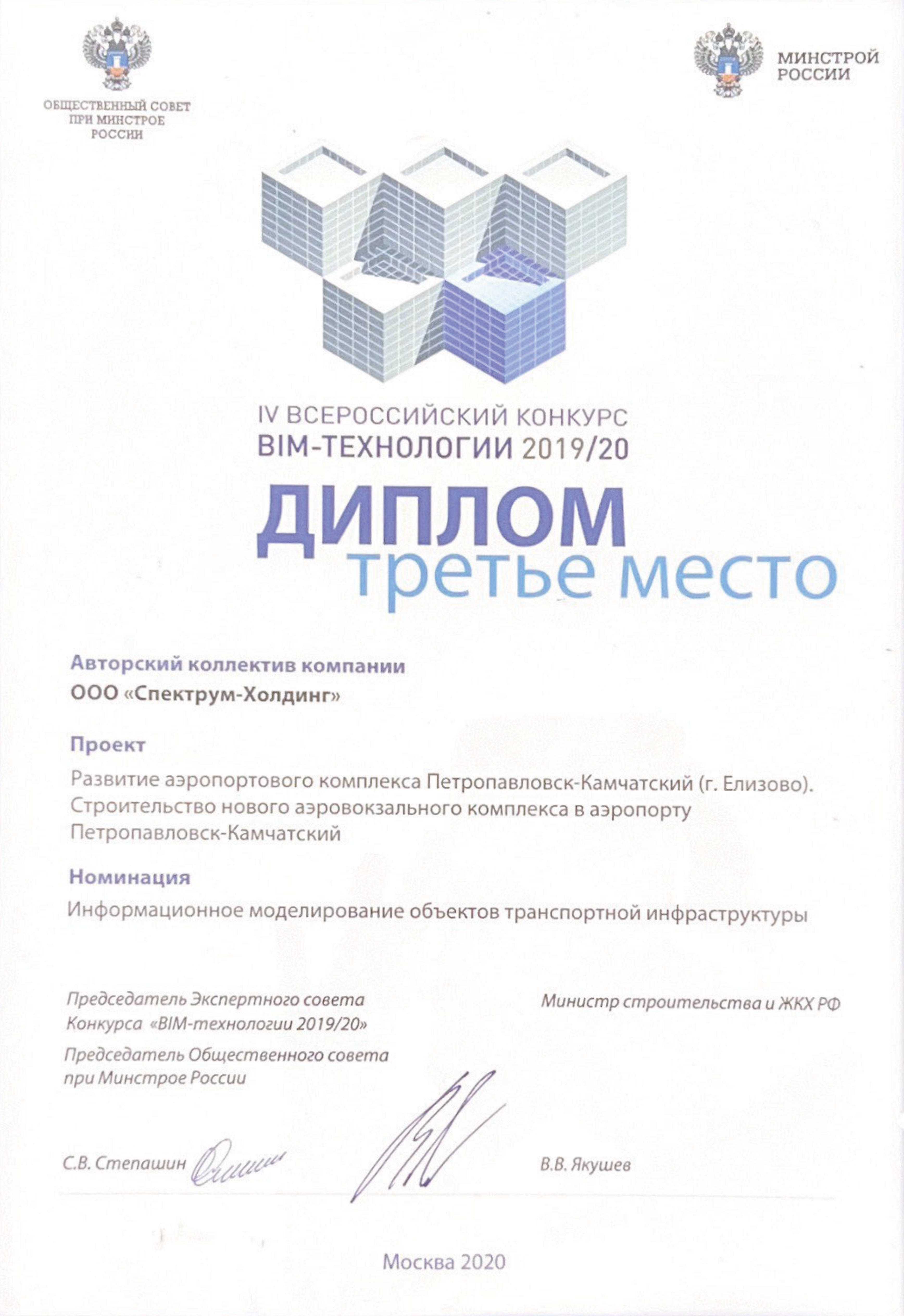«Спектрум» награждён дипломом за III место в номинации «Информационное моделирование объектов транспортной инфраструктуры» за проект «Развитие аэропортового комплекса Петропавловск-Камчатский (г. Елизово).
