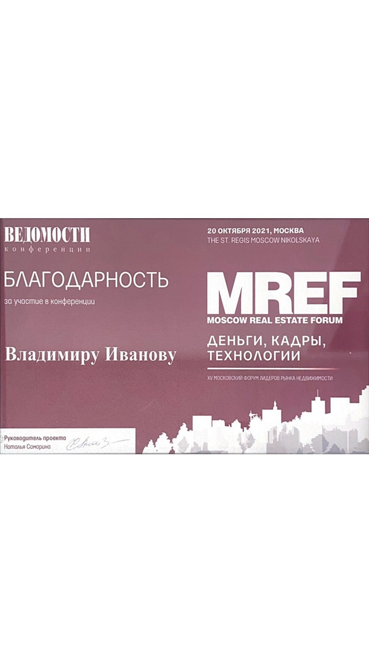 Владимир Иванов, Управляющий партнер ГК «Спектрум» отмечен благодарностью за активное участие в конференции газеты «Ведомости» на Московском форуме лидеров рынка недвижимости.
