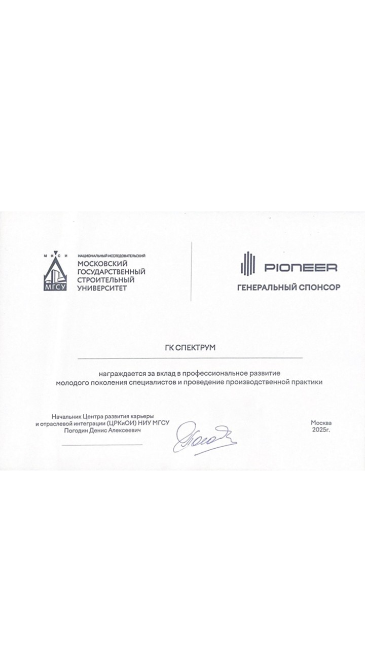 «Спектрум» награжден благодарностью за вклад в профессиональное развитие молодого поколения специалистов и проведение производственной практики.