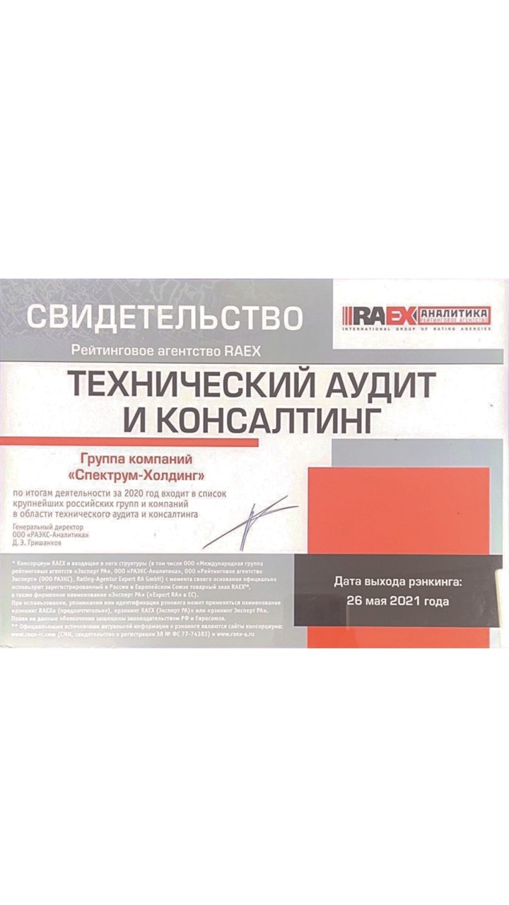 «Спектрум» по итогам деятельности 2020 года вошёл в число крупнейших групп и компаний в области технического аудита и консалтинга.