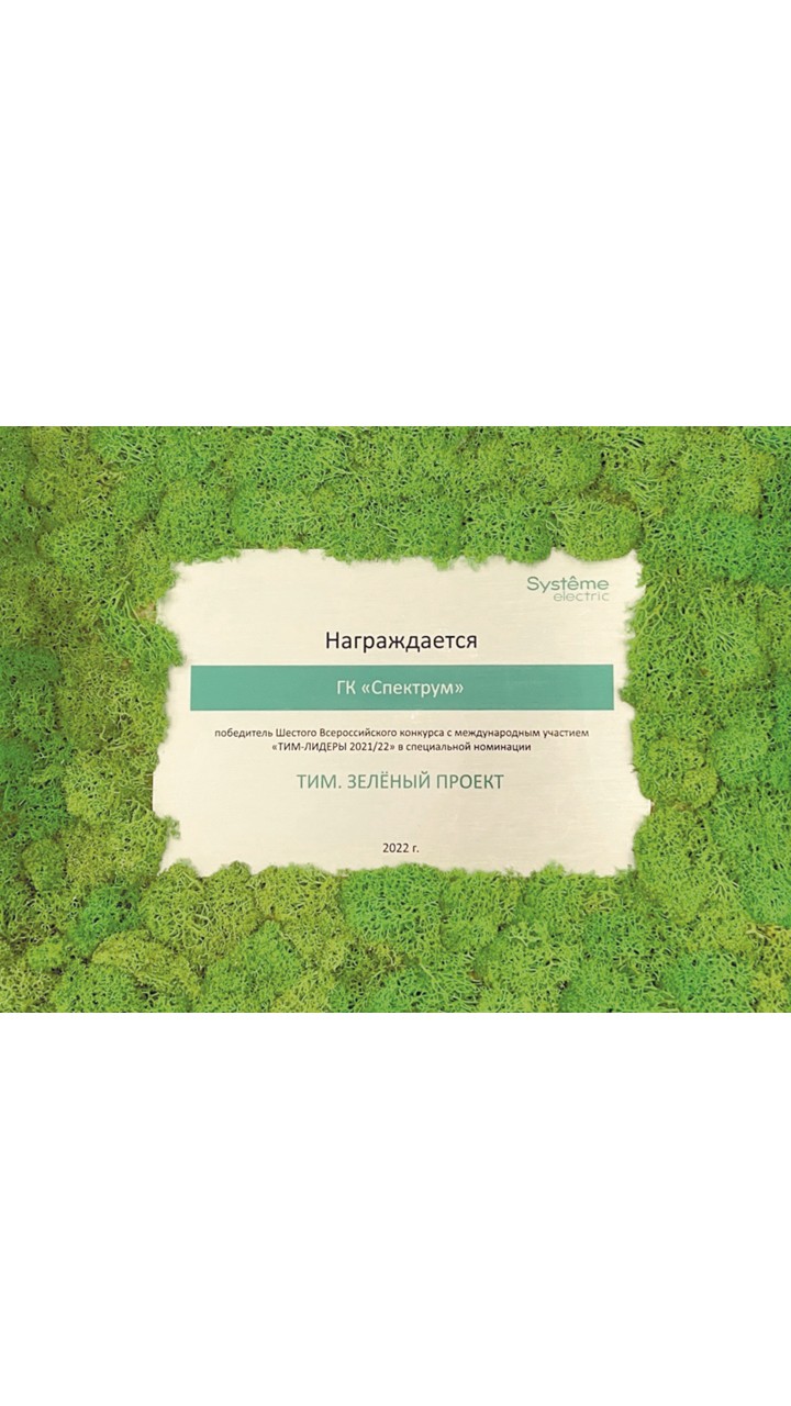 «Спектрум» стал победителем Шестого Всероссийского конкурса с международным участием ТИМ-ЛИДЕРЫ 2021/22 в специальной номинации ТИМ.ЗЕЛЕНЫЙ ПРОЕКТ.